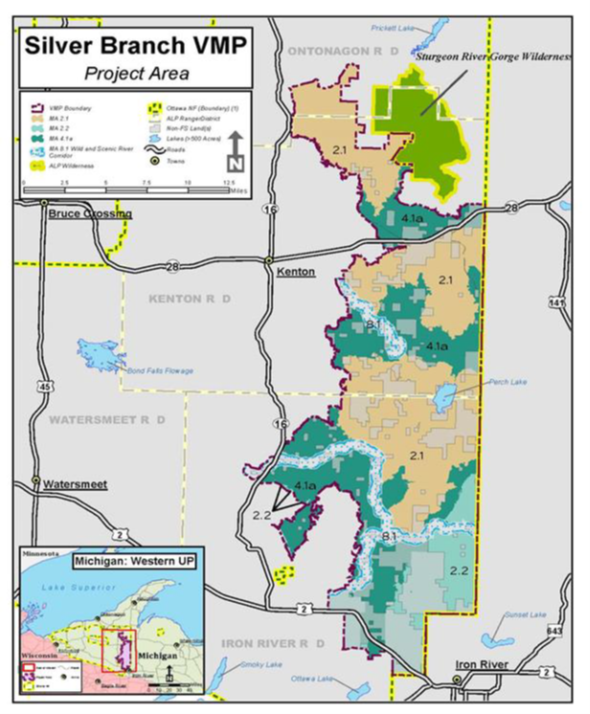 The Silver Branch Vegetation Management Project seeks to clear-cut aspen and paper birch trees and selection-cut and clear-cut northern hardwoods across a project area that extends for about 40 miles from the northern border of the Sturgeon River Gorge Wilderness Area south to U.S. 2 near Iron River. The vast proposal encompasses more than one-eighth of the entire national forest and about one-quarter of the Ottawa’s public lands deemed suitable for commercial logging.